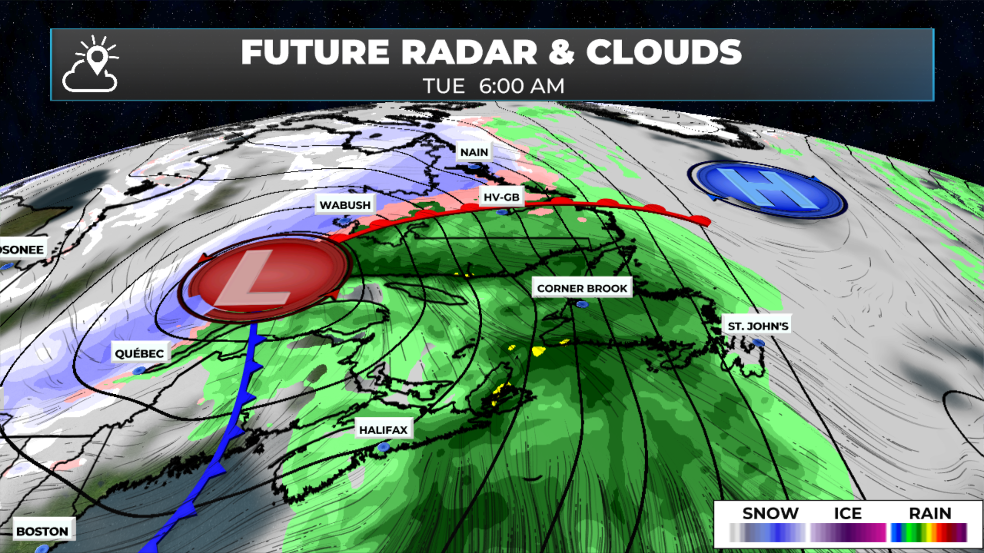 An area of low pressure is currently swirling its way through Quebec, and to its east, significant amounts of moisture are being pushed northward through the Maritime Provinces and into Atlantic Canada.
