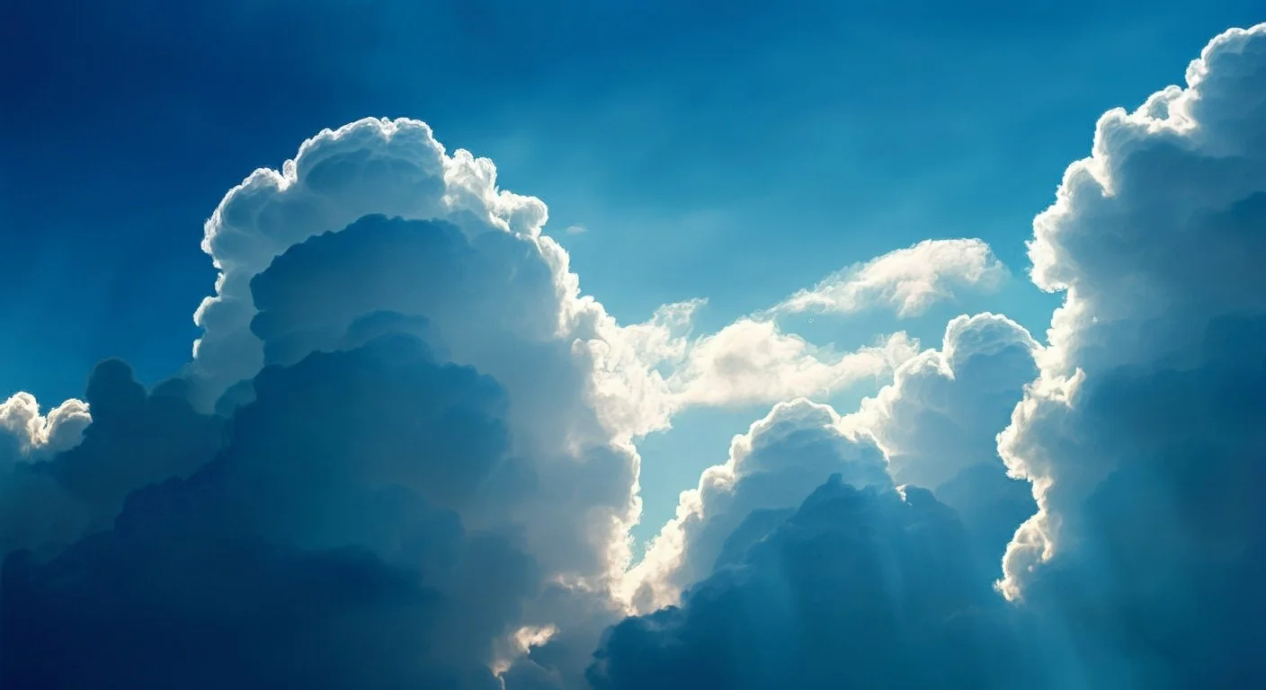 Bright blue sky with large, fluffy white clouds and rays of sunlight shining through.