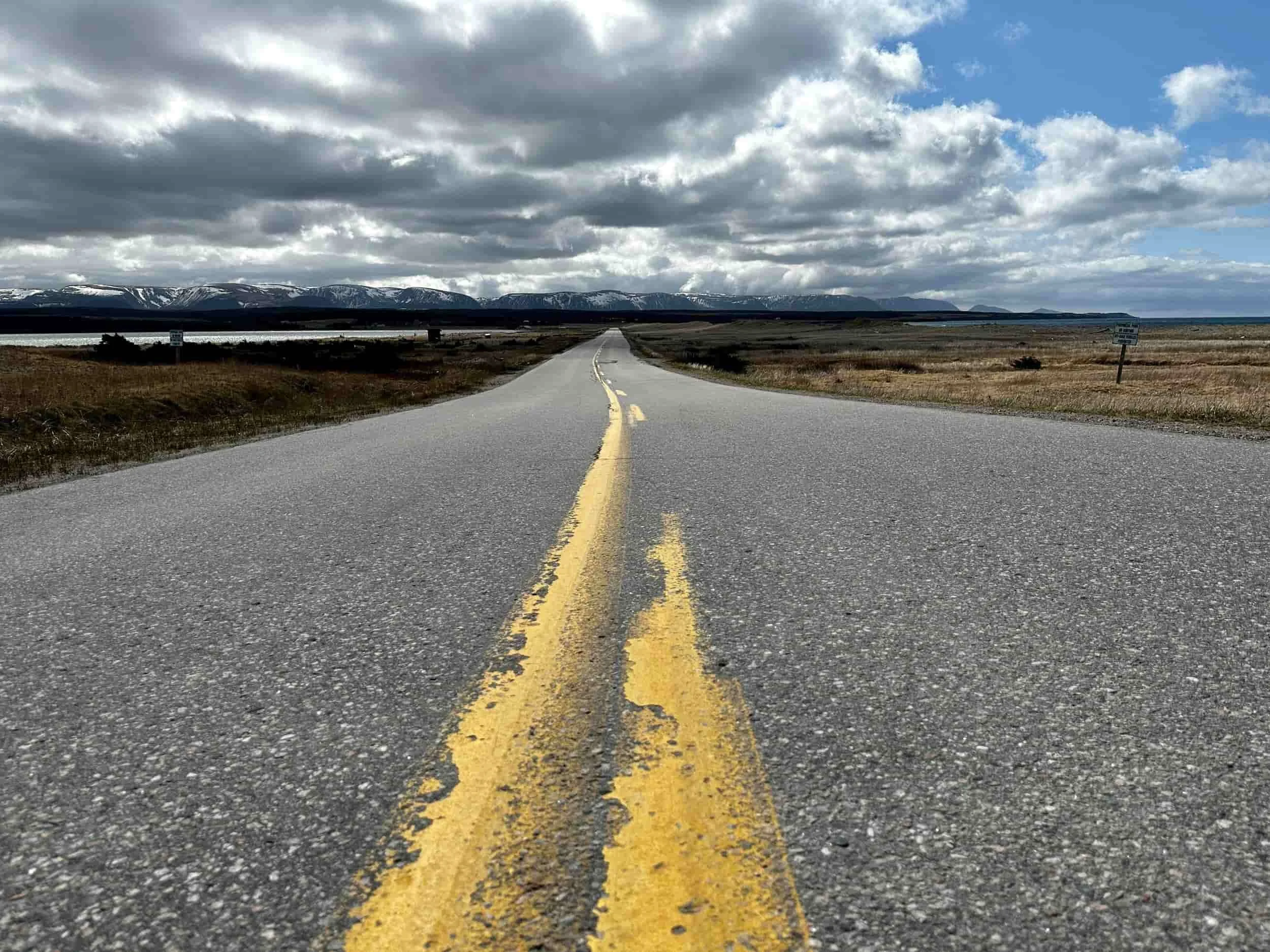 Double yellow lines on the open road with blue sky and clouds above