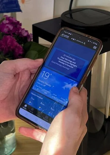 Person holding a smartphone displaying weather information, with a plant and a black device on a small white table in the background.