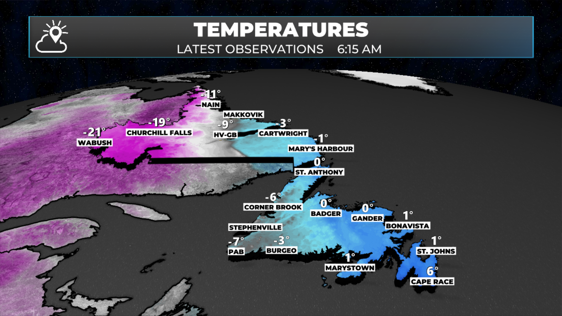 As we look at the temperatures this morning, we can clearly see the differentiation in where the cold air is and where it isn’t. That cold air will continue to ooze across the Island through the rest of the day. Right now, temperatures are about as warm as they’re going to be today for most areas. The exception will be the Northern Peninsula and parts of the Labrador Coast, where the Arctic will not arrive until later today or tonight.