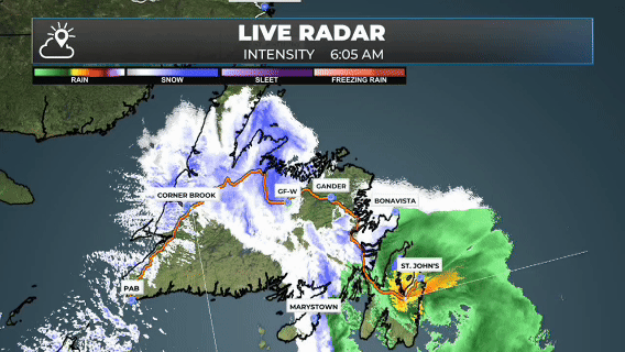 Areas of rain and snow are being reported across NL this morning as an arctic cold front moves from west to east across Newfoundland and Labrador. The air behind this front is much, much colder than the air ahead of it. The radar image below shows rain on the Avaon and snow elsewhere on the Island at this early hour.