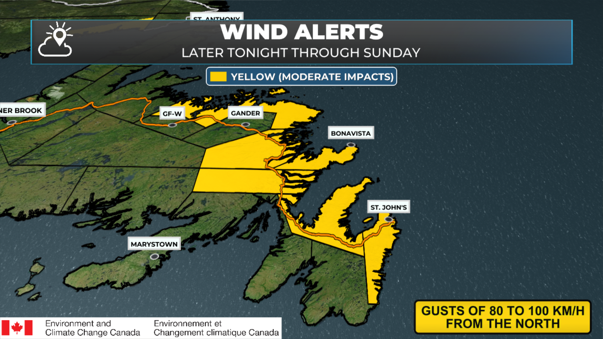 Wind speeds will gust as high as 80 to 100 km/h from the north to northeast between later tonight and Sunday.