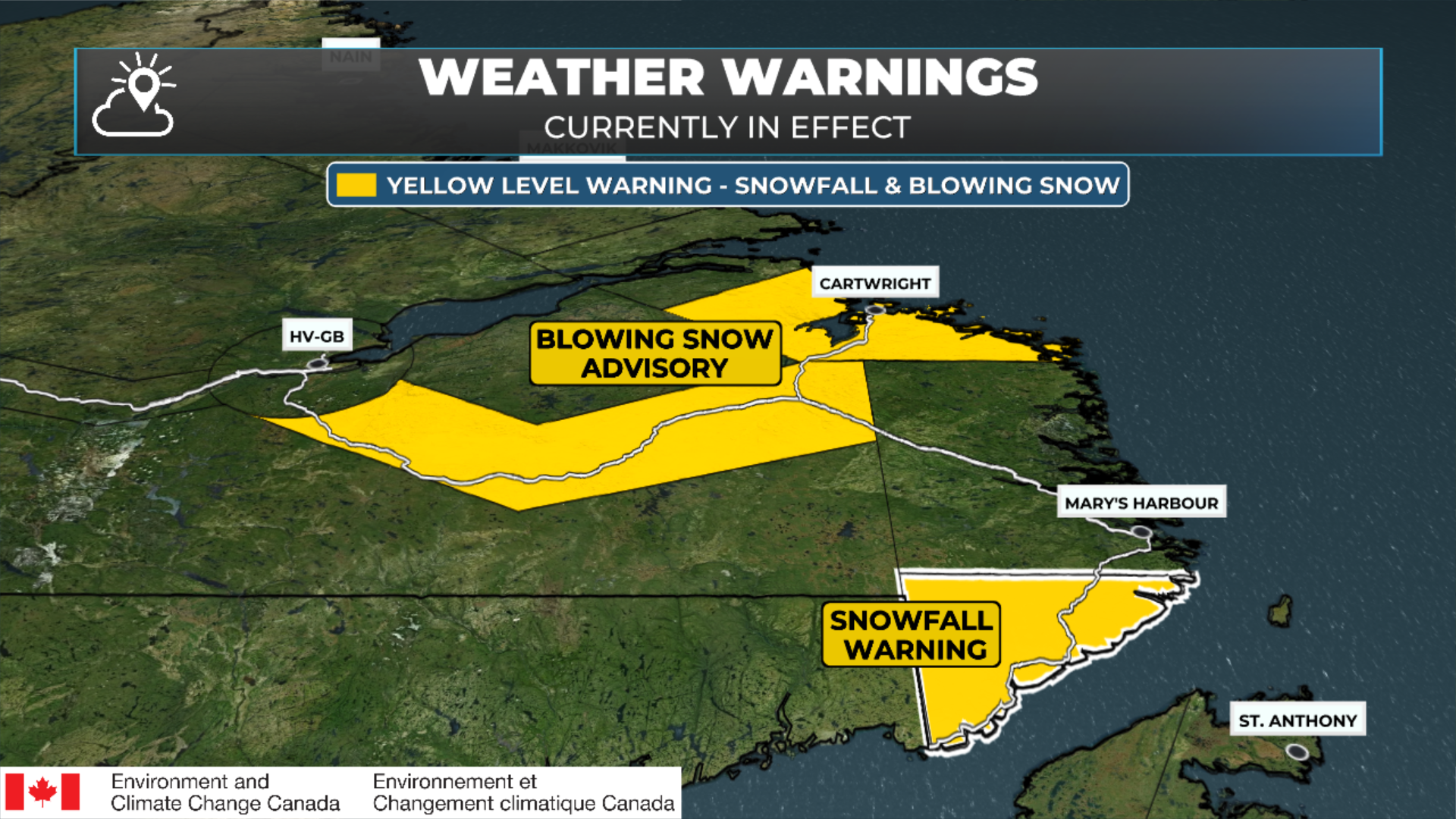 A Snowfall Warning remains in effect for Red Bay to L’anse-au-Clair until noon today for an additional 2 to 4 cm of snow, except as much as 10 cm north of Red Bay.