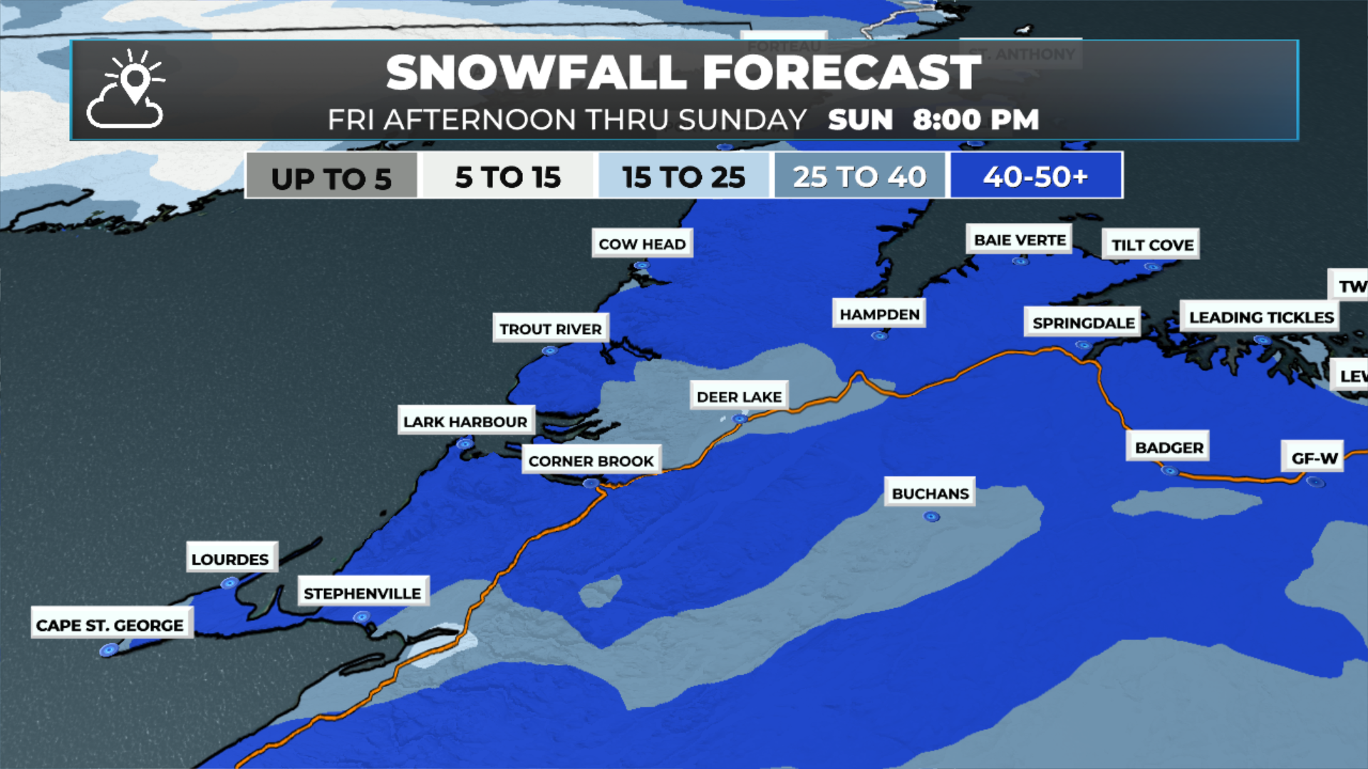 Expected Snowfall: 25 to 50 cm (lower amounts on the south and southeast coast — closer to 15 to 25 cm)