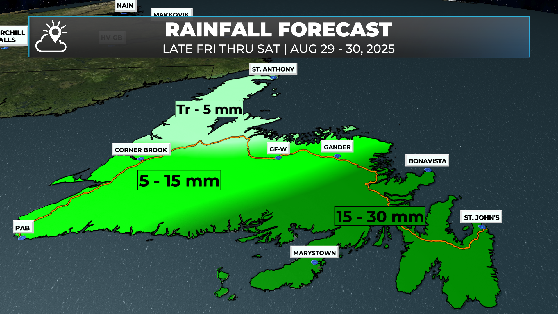 The heaviest rain will be found over eastern Newfoundland, with lighter amounts found in the west. The middle thrid of the Island will see moderate amounts. As of this morning, I’m expecting a widespread 15 to 30 mm for eastern areas, with locally higher amounts.