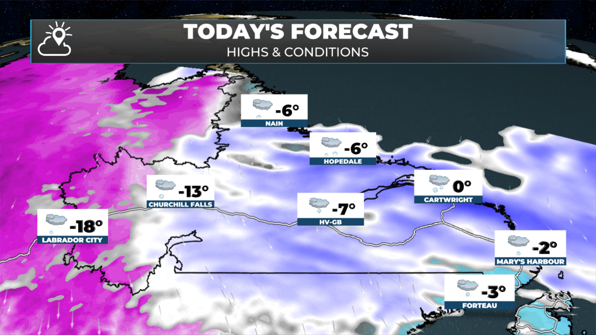 The weather across Newfoundland will be much calmer today compared to the last few days, as our area of low pressure has finally departed and the snow in the east and northeast has ended. St. John’s International recorded 48 consecutive hours of weather observations with snow falling! Expect highs in the single digits below freezing today. While it will not be as breezy as the last couple of days, wind chills will be into the minus teens thanks to wind speeds of 15 to 30+ km/h.