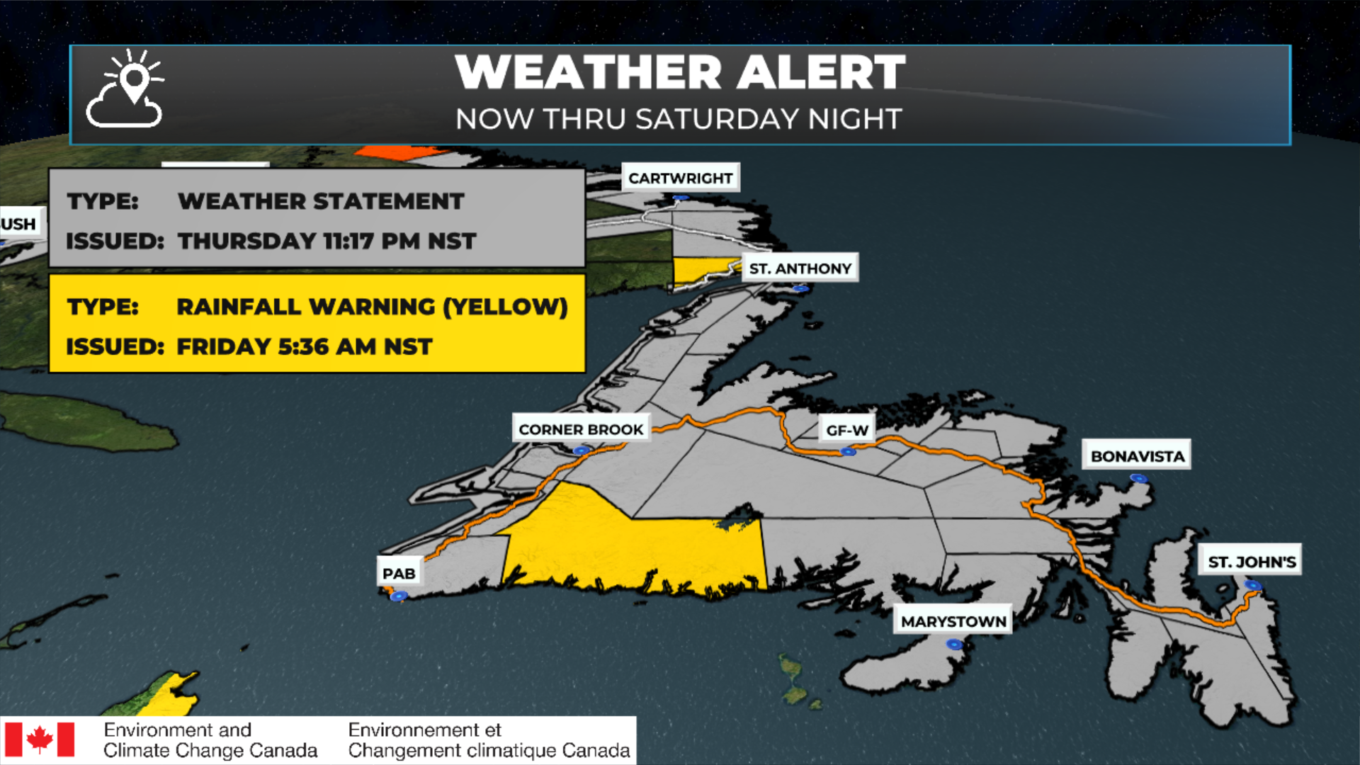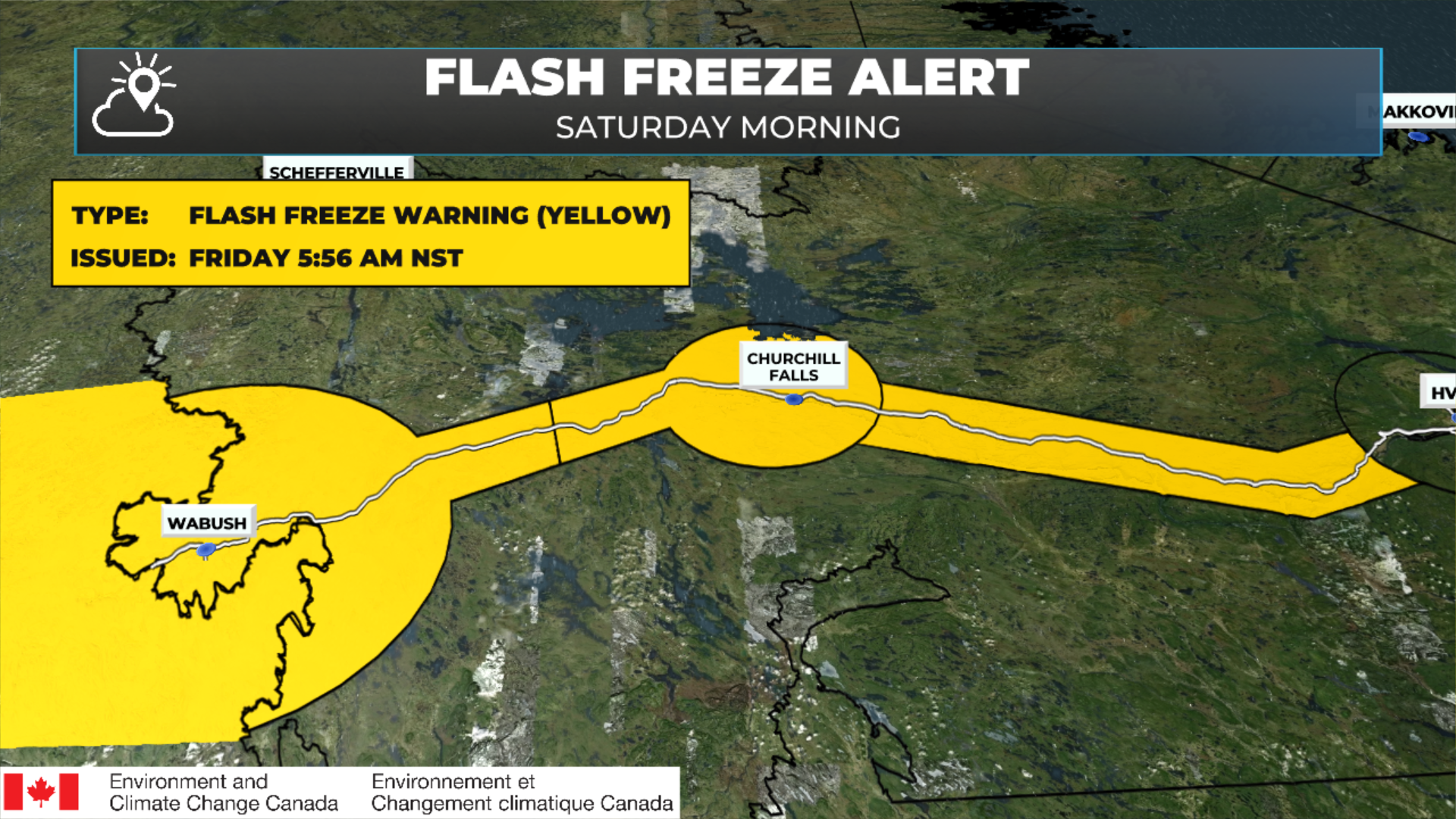 Due to the expected wind, rain, and snow (Labrador), Environment Canada has issued various weather alerts for Newfoundland and Labrador. In addition, a Flash Freeze Warning is in effect from Churchill Valley to Labrador City for Saturday, as colder air rapidly sweeps back into the region following today's thaw.