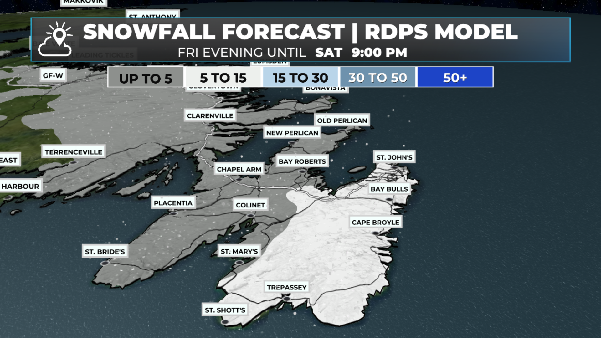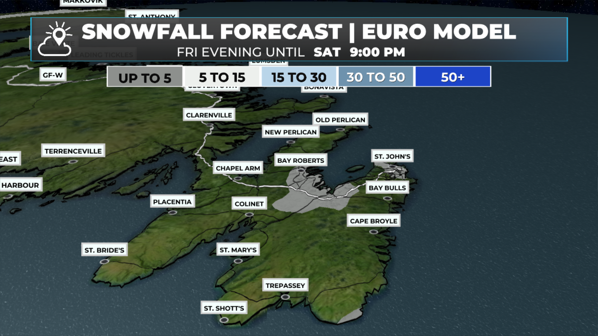 A low-pressure area will pass east of the Avalon Peninsula between Friday night and Saturday. This low looks to remain far enough offshore that its significant snowfall should also remain east of the Southern Shore. That said, it looks like parts of the Avalon Peninsula, especially in the east, may pick up 5 to 10 cm of snow between later tonight and Saturday.