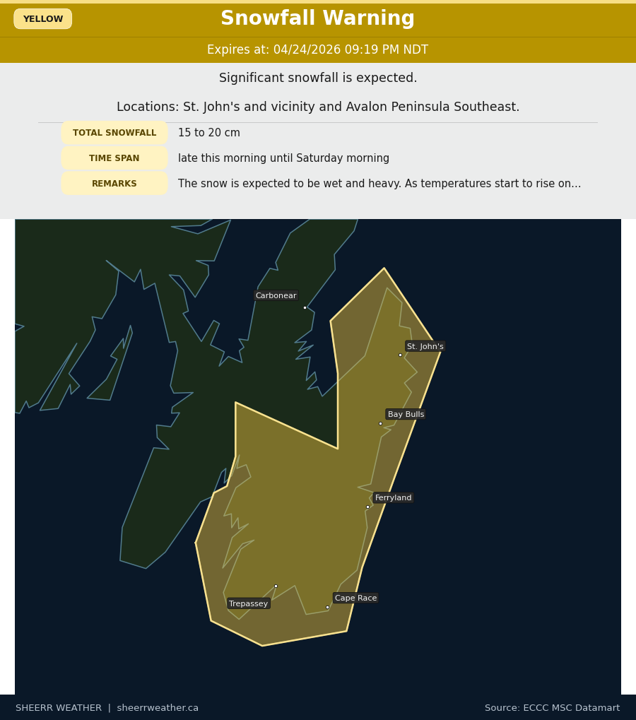NL's expected snowfall from this afternoon until Saturday morning (April 24 - 25, 2026)