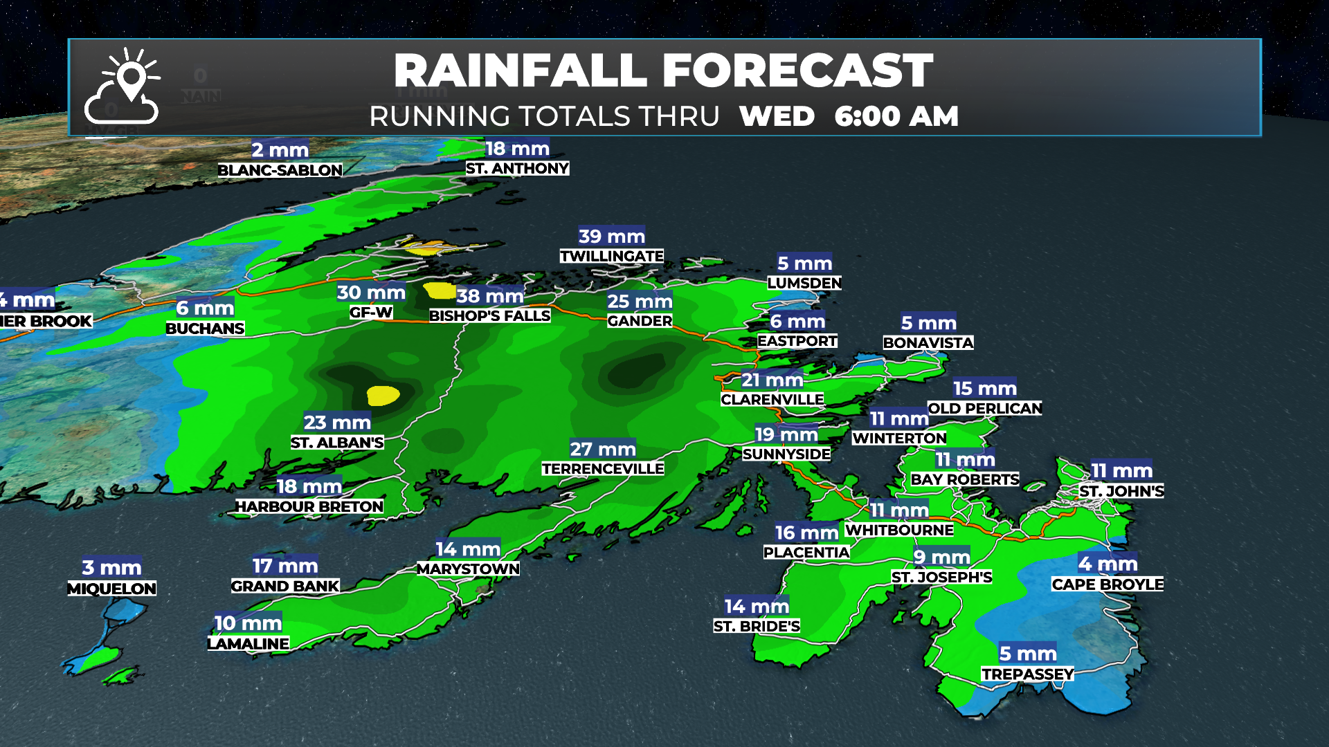 Weather conditions are expected to make a significant contribution to fire suppression, as rain is forecasted to fall over eastern Newfoundland tonight and Tuesday.