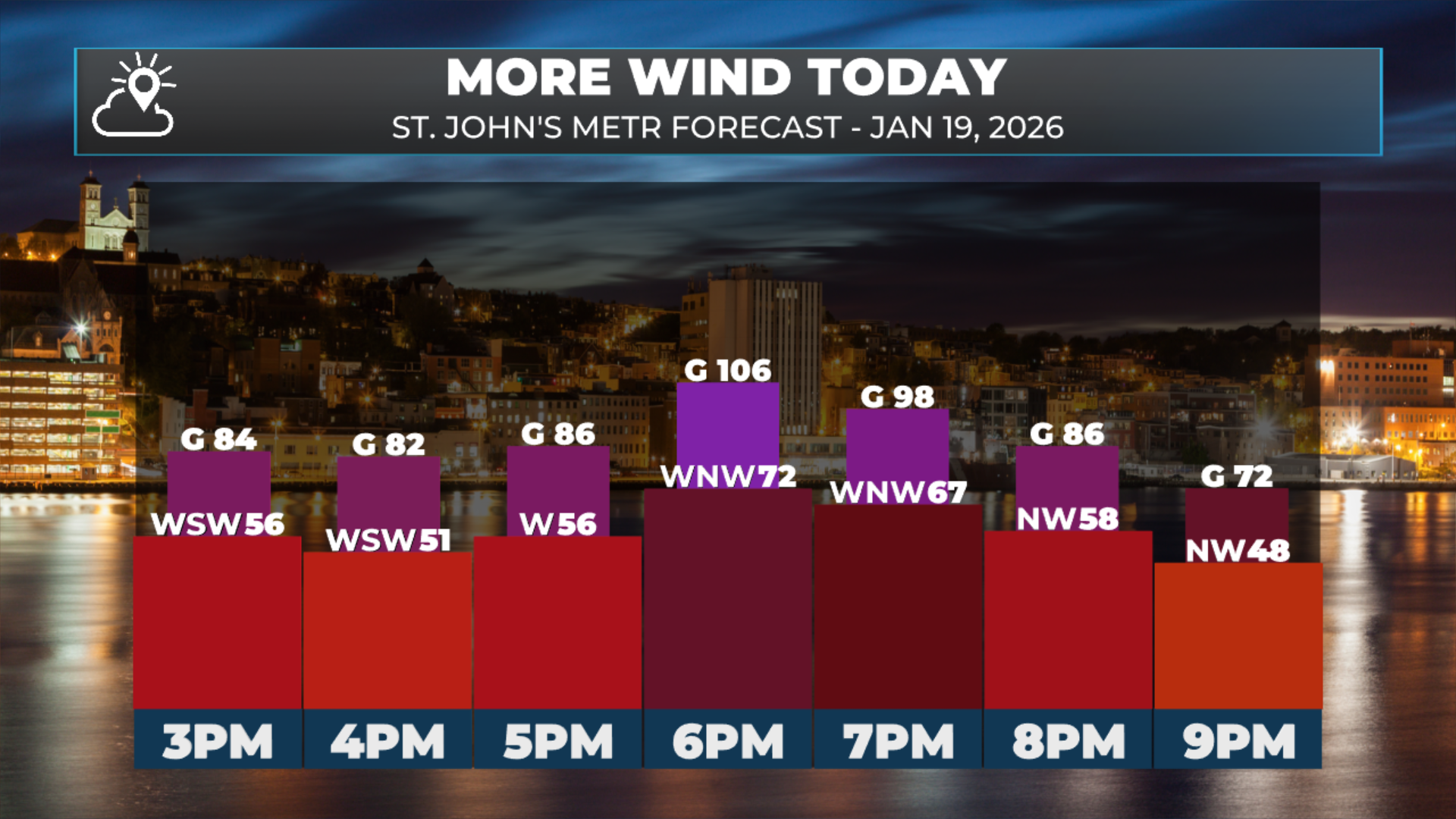 Another round of wind will be felt over eastern areas this afternoon and evening, with gusts expected to reach or exceed 100 km/h (again) over exposed areas. This includes the Avalon and St. John’s Metro.