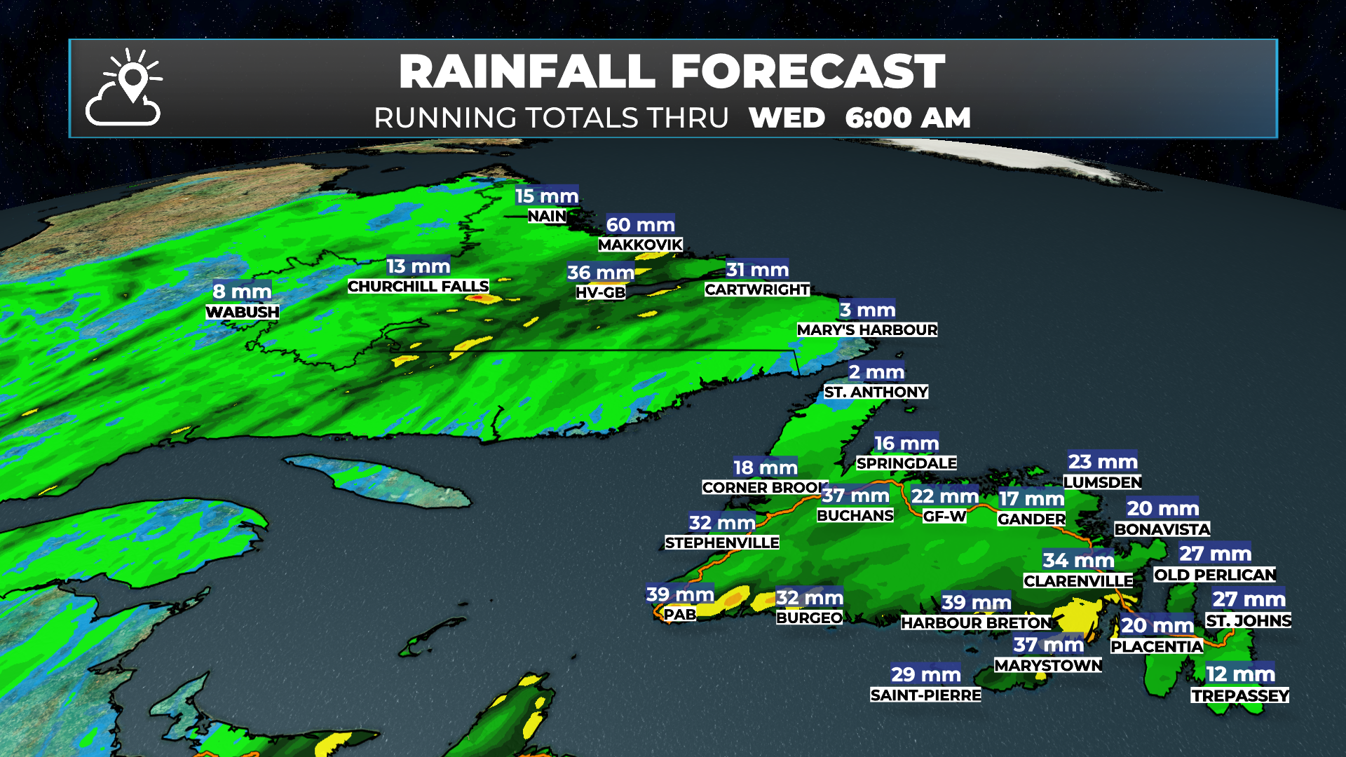 The rain moving through Labrador West today and tonight is in conjunction with an area of low pressure. As the low spins through Labrador tonight and Tuesday, it will bring a fair amount of rain with it. The rain that arrives tonight is expected to persist through Tuesday and Tuesday night before ending on Wednesday morning.