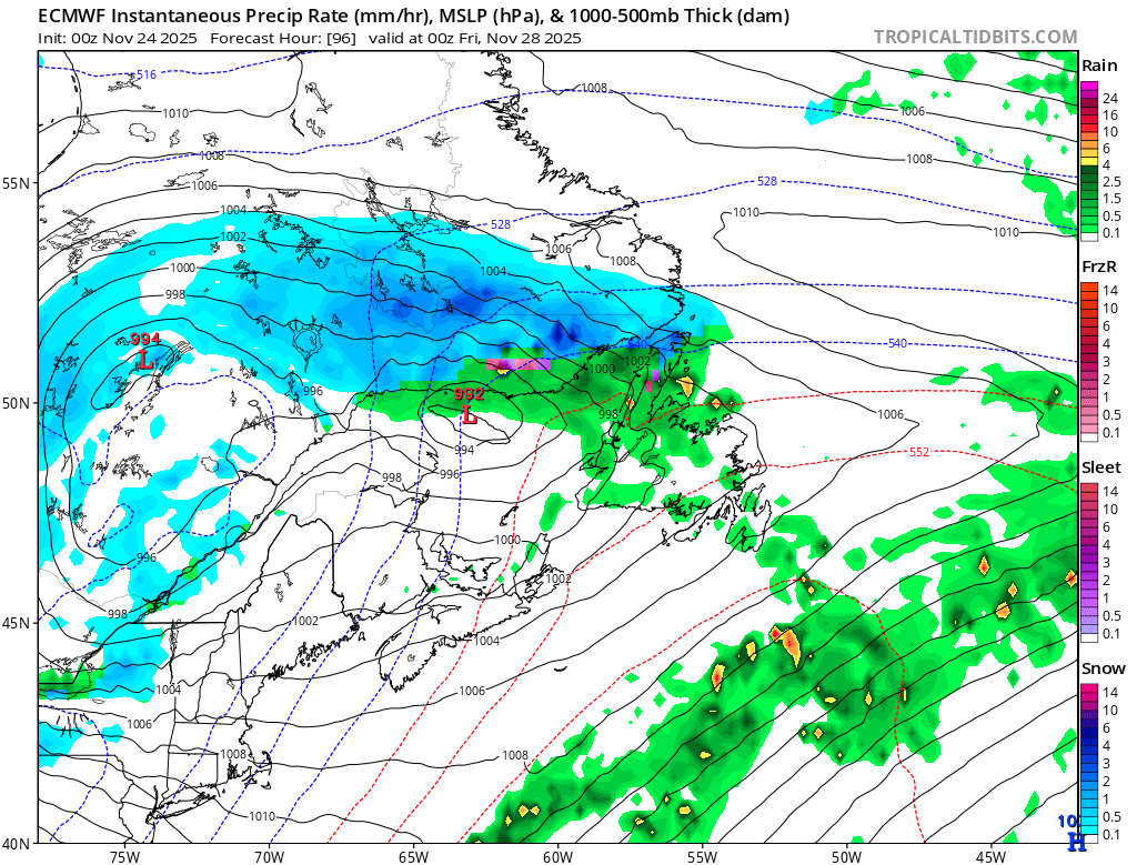 Wednesday may see a similar, weak, fast-moving disturbance move through. The next significant weather-maker arrives on Thursday. This will be another low-pressure centre that cuts west of Newfoundland. This means more rain and mild temperatures for the Island snow for Labrador from Thursday into Friday.