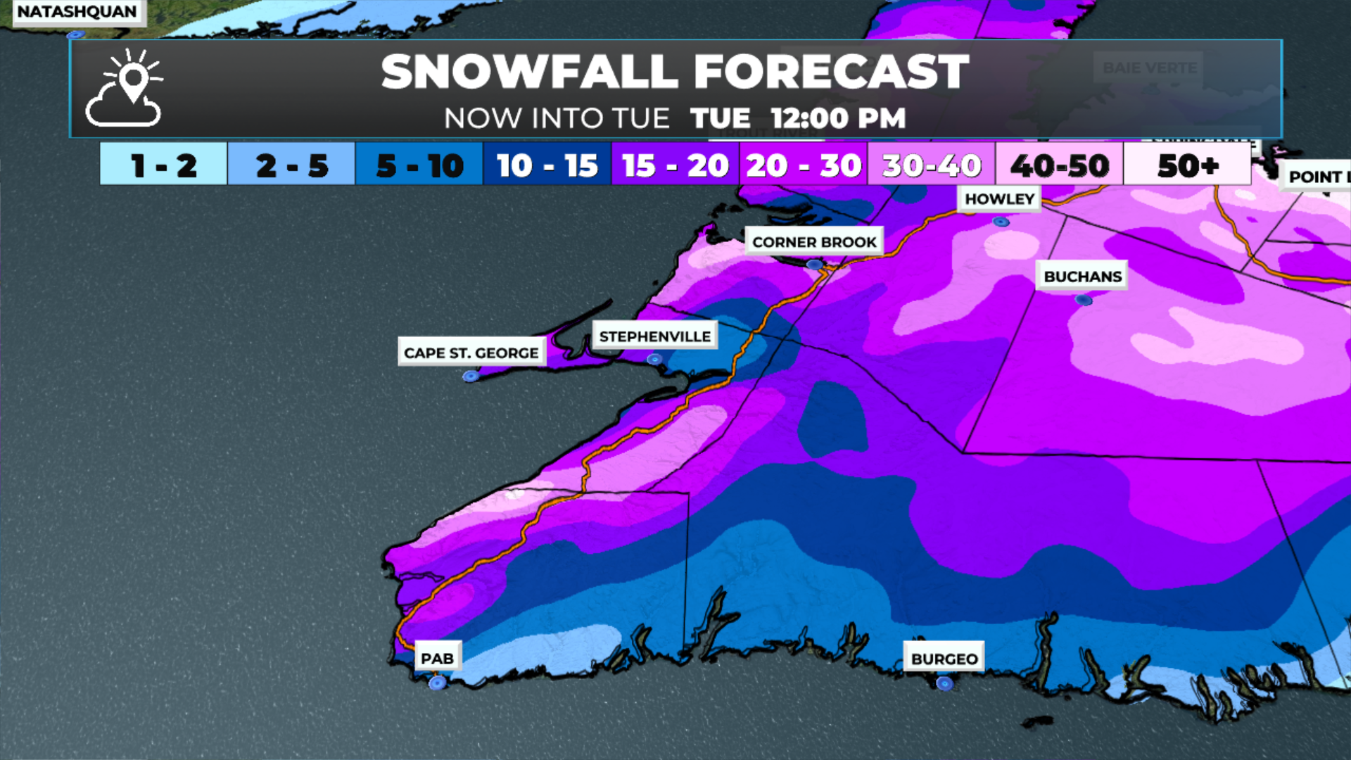 Snowfall totals today will vary by location, but overall, we are looking at widespread 20 to 40+ cm across a large swath of the western half of Newfoundland between last night and early tomorrow. Some eastern areas that see a change to rain today will see another round of snow this evening. That second round may be significant to parts of the northeast coast, Bonavista, and the Avalon Peninsula, depending on where exactly it sets up.