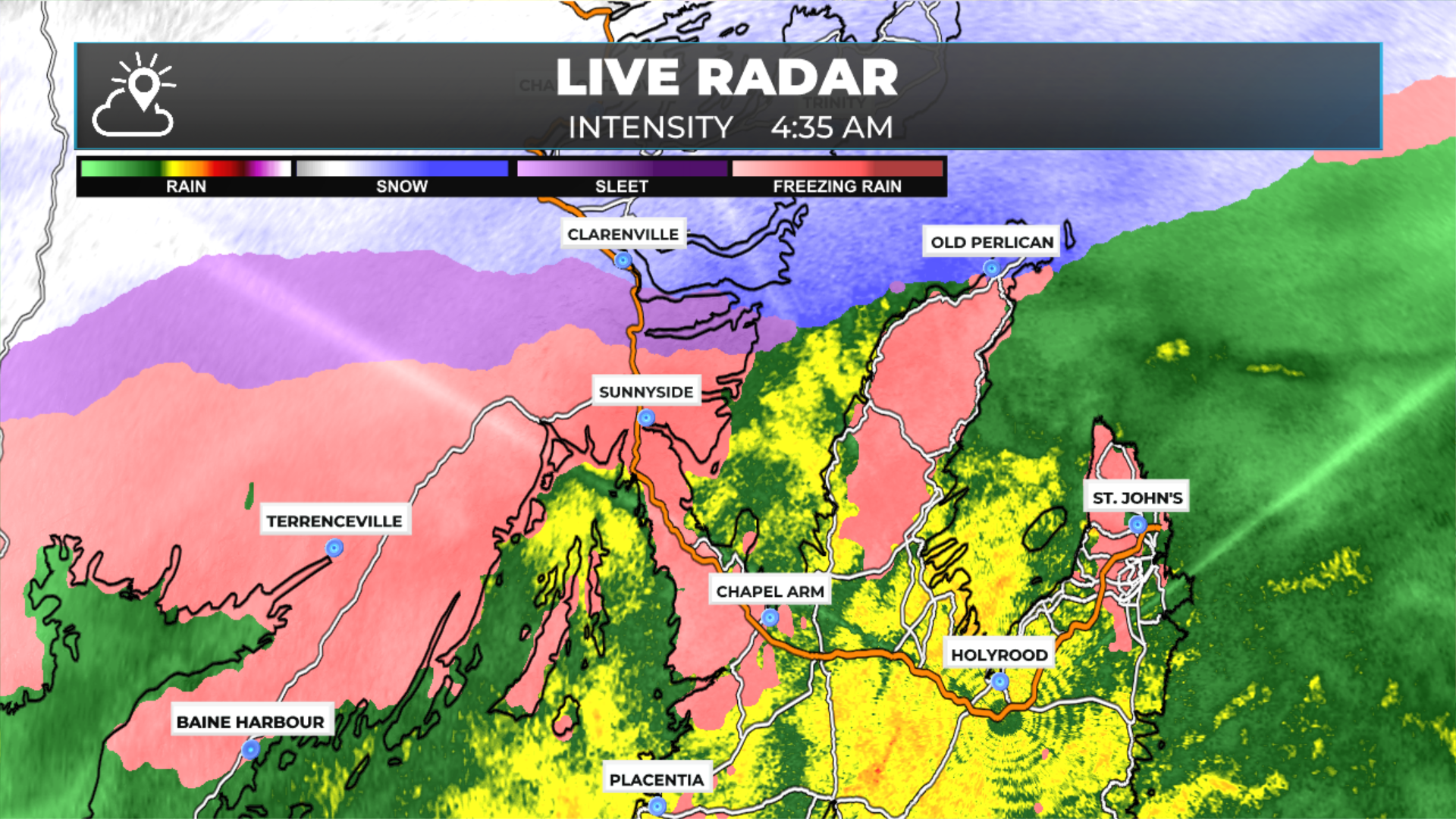 We are in the midst of another major winter storm as we begin this new workweek. Snow is currently falling across much of the Island, but as of 4:45 AM, the snow has changed to freezing rain or rain across a large portion of southeastern Newfoundland—meaning the Avalon and Burin Peninsulas. The radar image(s) from below illustrate that well.