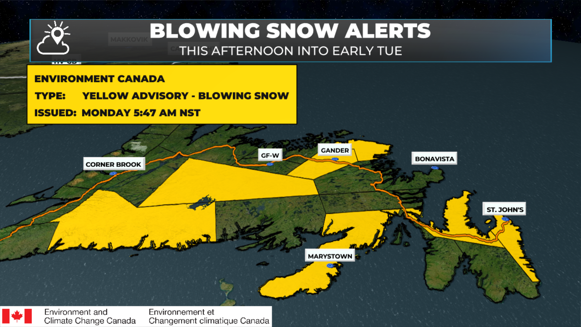 The Avalon Peninsula North, St. John’s, and the Burin Peninsula will see blowing snow late this evening into the overnight, with northwesterly gusts of 80–110 km/h leading to near-zero visibility at times.