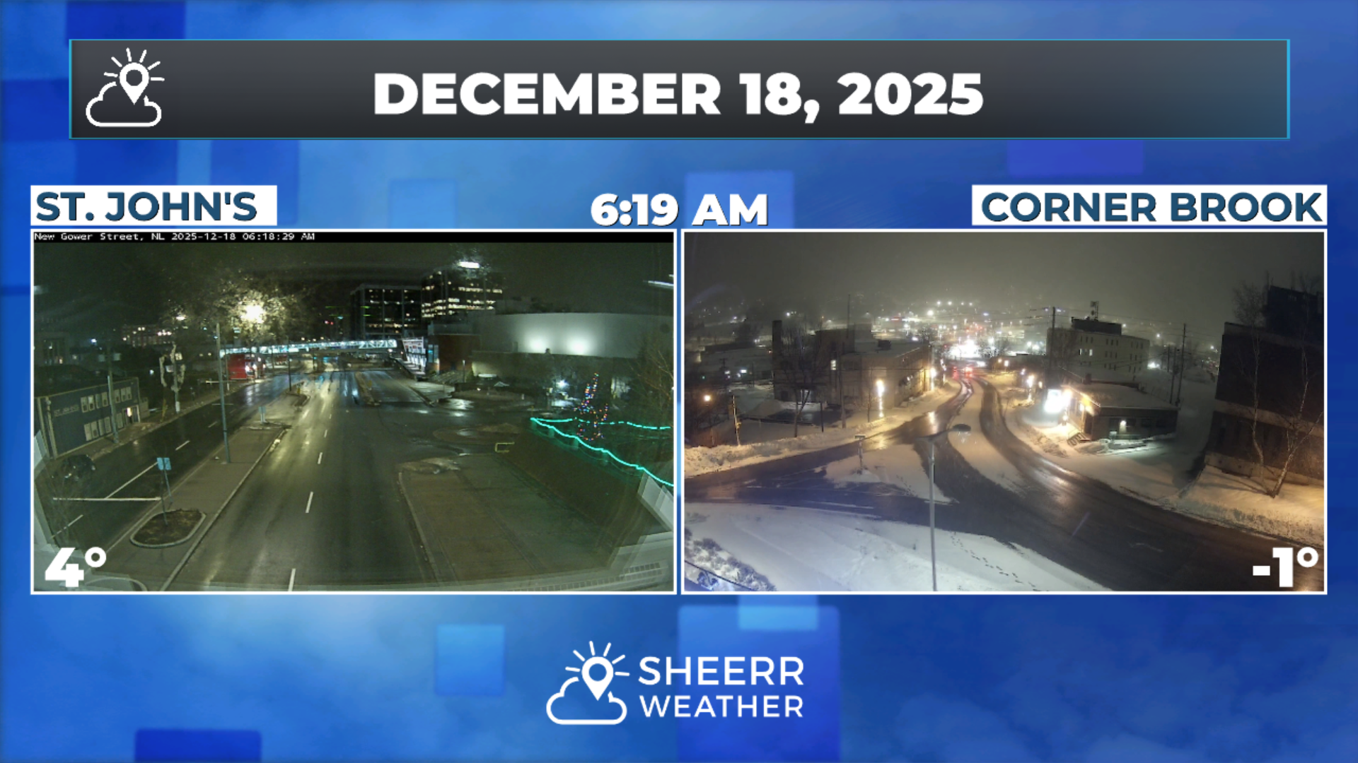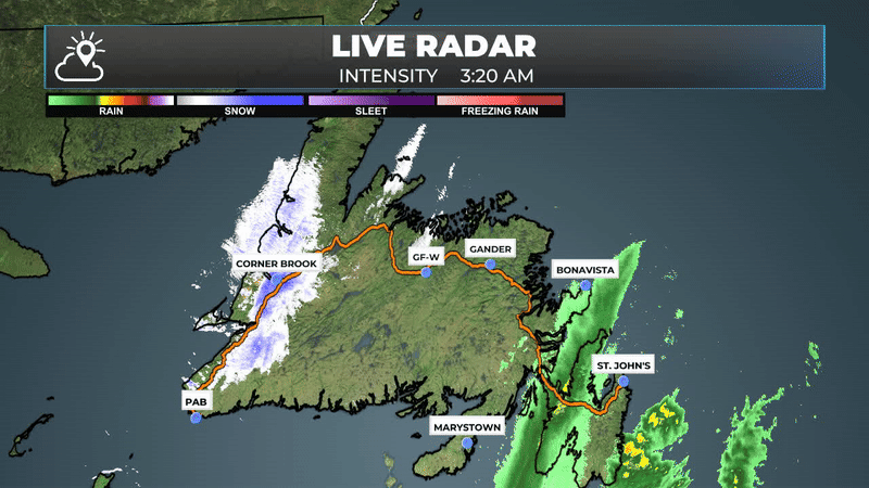 A cold front is currently moving across the island. Ahead of the front, we are experiencing mild temperatures and rain showers, while it’s colder behind the front with areas of flurries and light snow. The rain is mainly over the eastern parts of the island, and the snow has started in the west. The image (above) showing Corner Brook and St. John’s illustrates this well. The radar gif (below) provides a good idea of what’s happening right now.