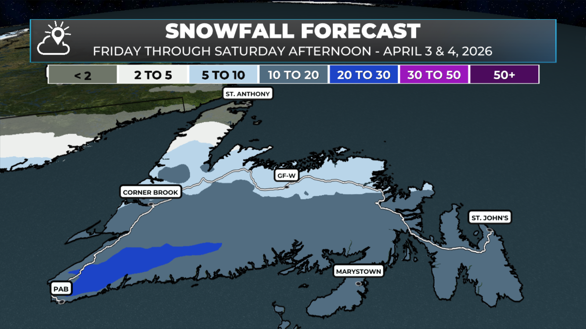 Another round of snow will move into western areas Friday afternoon, and will work across the Island reaching eastern areas overnight. The snow will end in the west early Saturday morning, while eastern areas and the Avalon will not see the snow end until late morning or early afternoon. Snowfall amounts don’t look overly heavy, but the potential is certainly there for up to 20 cm in the south, while the Northern Peninsula will see less than 5 cm.