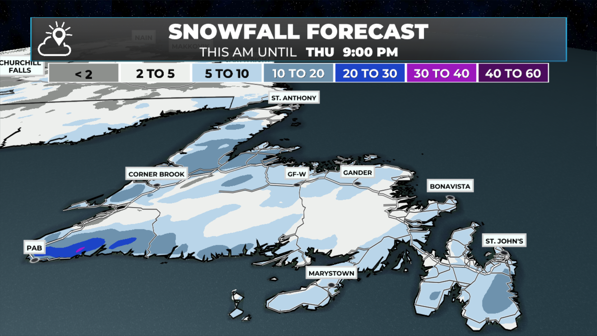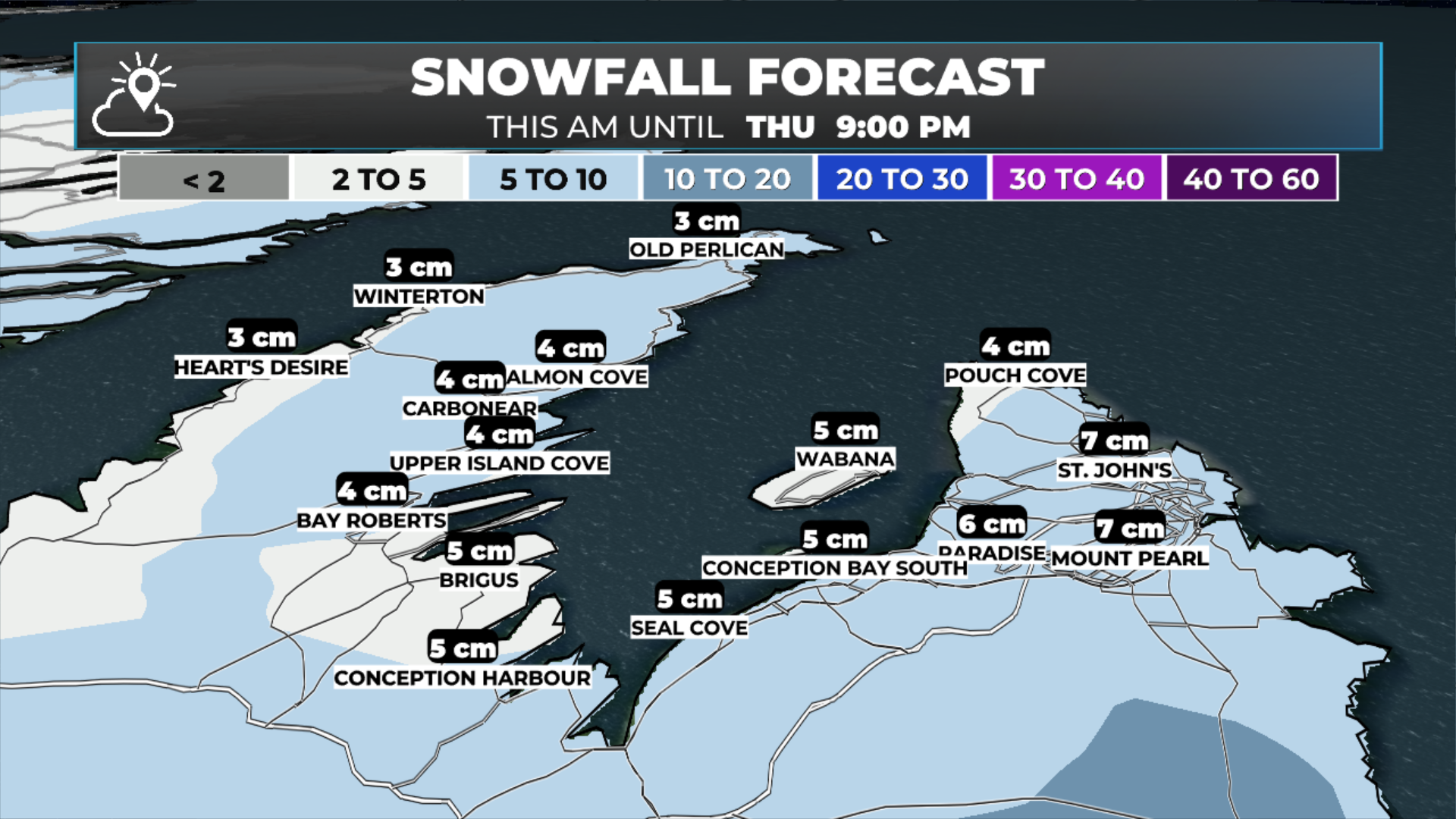A Special Weather Statement is in effect for the Avalon and Burin Peninsula this morning for the threat of 5 to 10 cm of snow this morning, with rates as high as 3 to 4 cm per hour for a short time. Higher amounts are possible locally, especially over higher terrain.