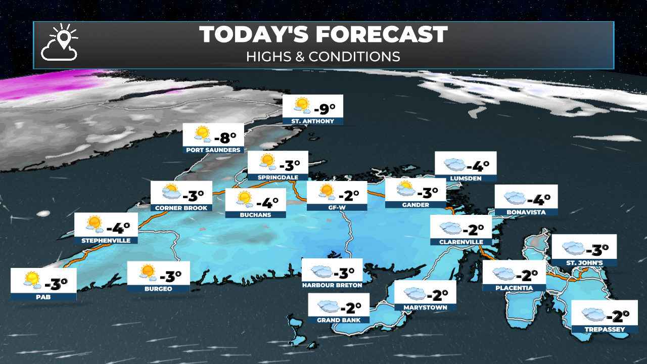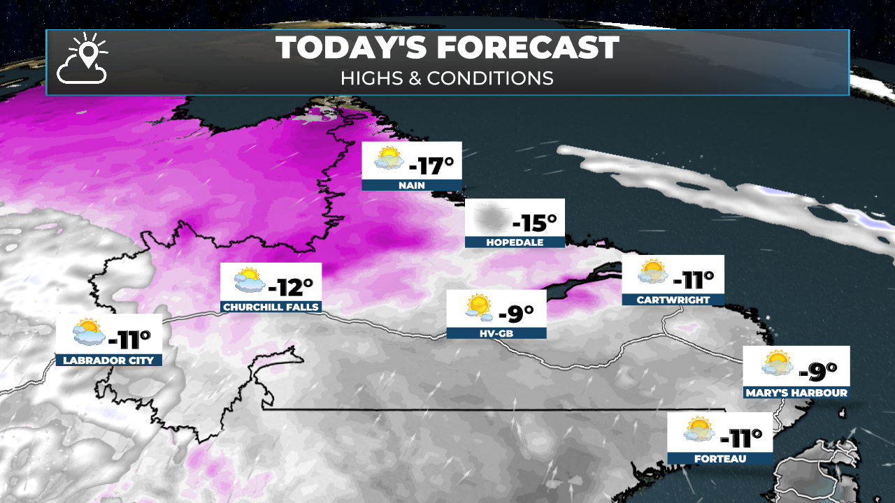 For today, we can expect mostly sunny skies over Labrador and the majority of Newfoundland. The exception, surprise-surprise, will be on the Avalon, where skies look to remain mostly cloudy thanks to an area of low pressure offshore. Temperatures will peak at near -3ºC across much of the Island, with colder readings on the Northern Peninsula. High temperatures in Labrador will slowly rise into the minus teens after a bitterly cold start this morning.