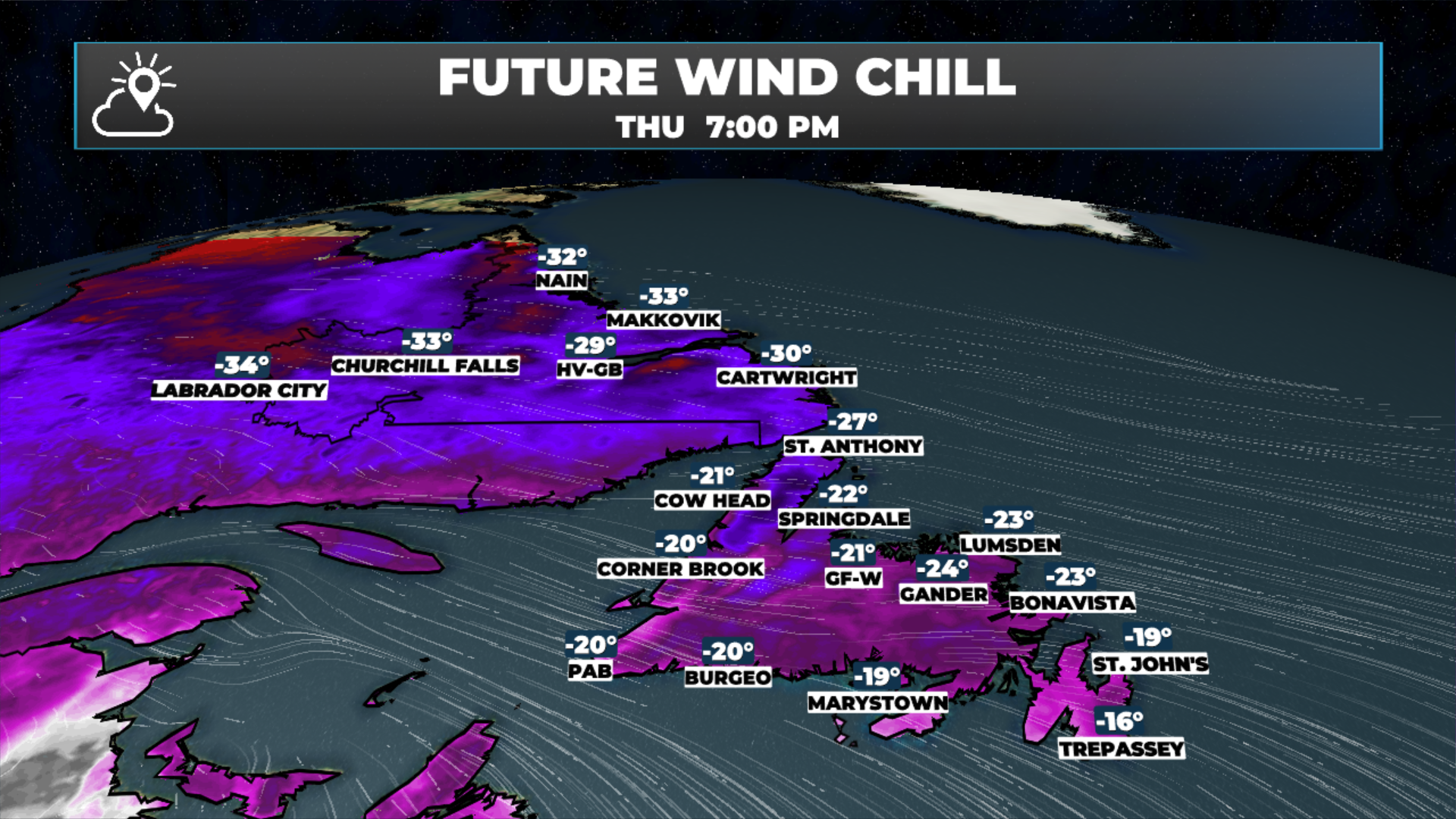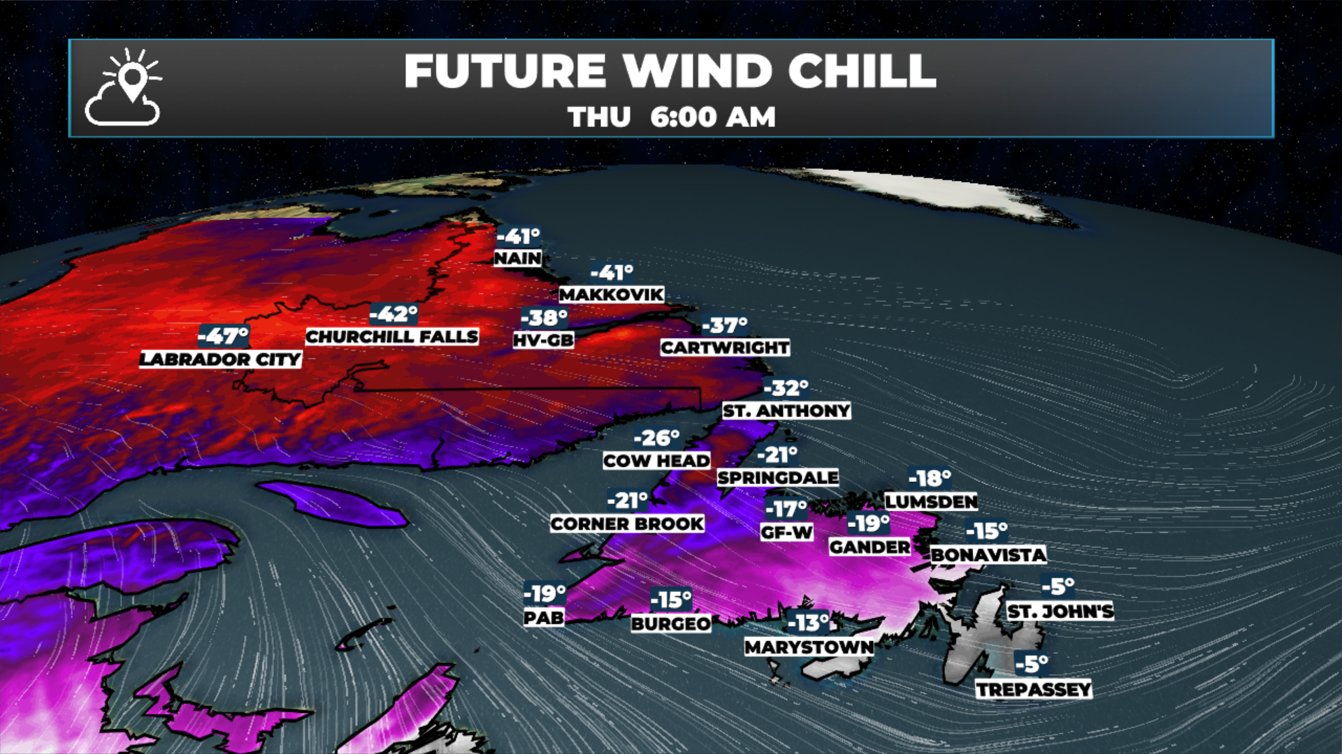 Arctic air is settling across the Province this morning — wind chills will be in the minus 20s to nearly -50ºC across NL at times today. Yellow Level Extreme Cold Warnings are in effect for the Great Northern Peninsula and all of Labrador’s alert areas.