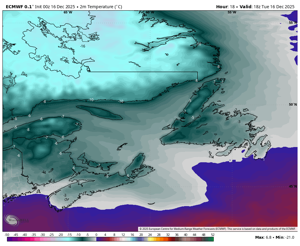 Forecast temperatures this afternoon (December 16, 2025)