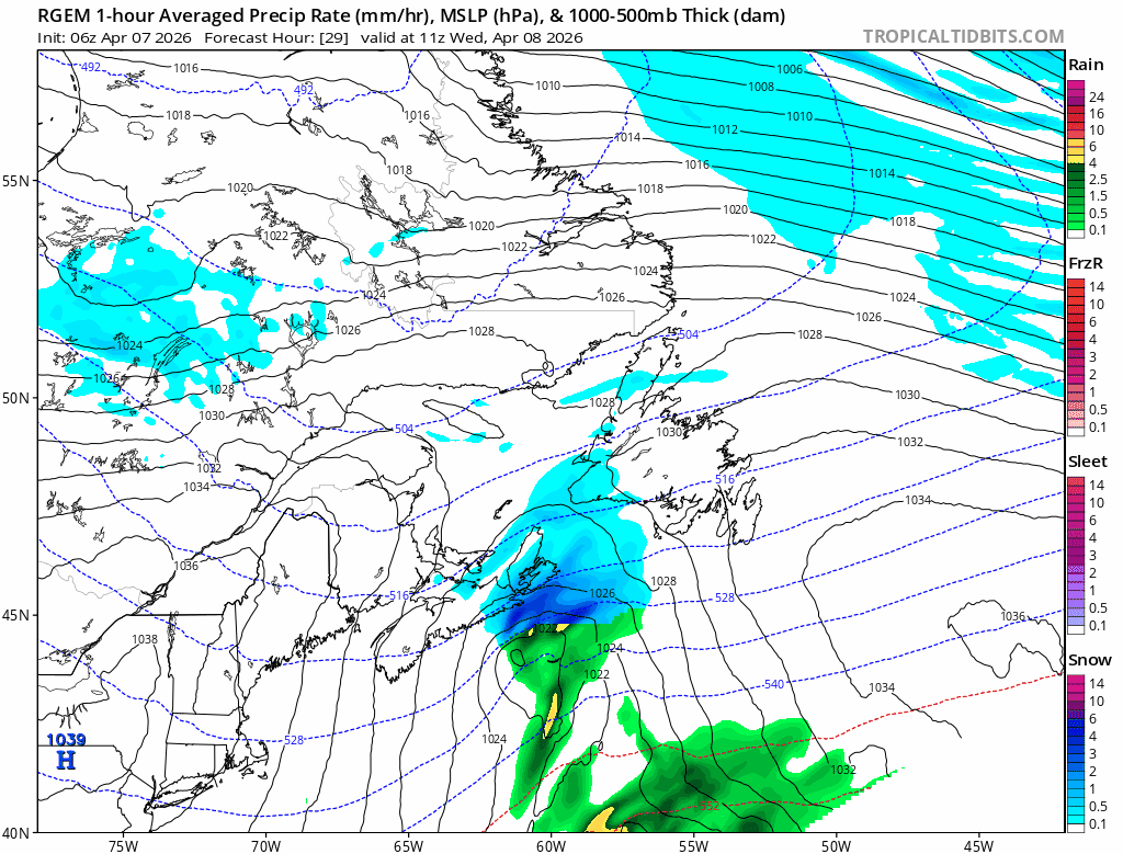 Today is a bit of a breather across Newfoundland and Labrador, and you can see that reflected in the lack of meaningful precipitation signals through much of the day. We’re sitting under relatively quiet conditions, so while there are a few flurries around, especially in typical upslope and coastal areas of the west coast, most places are just seeing a mix of sun and cloud. Temperatures are pretty seasonable for early April — near the freezing mark on the Avalon, a touch colder as you head west, and still firmly in winter mode across Labrador where highs are stuck in the minus single digits and teens.