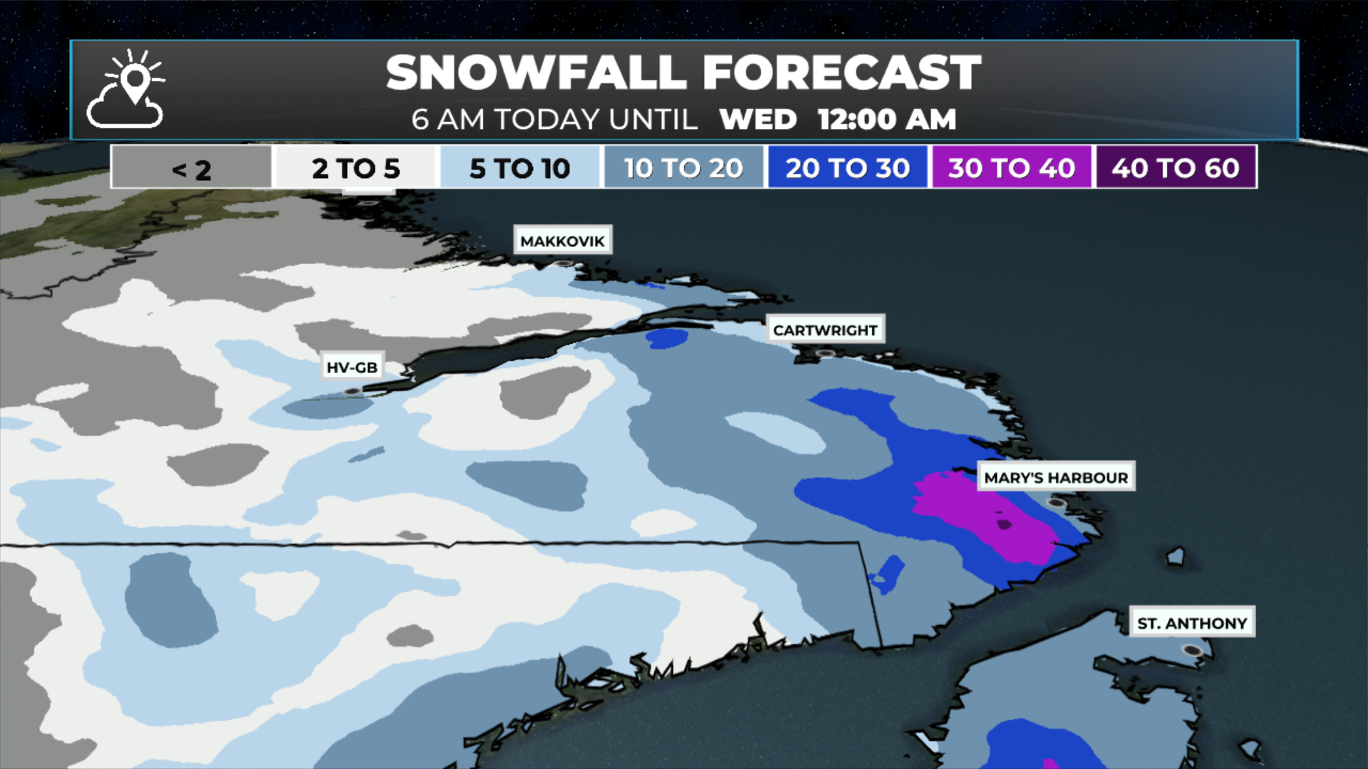 Yellow Level Winter Storm Warnings are in effect for southern areas of Newfoundland, Green Bay-White Bay, the Northern Peninsjua and southeast Labrador. Details on the alerts here.