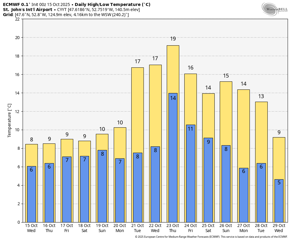 The weather pattern driving this change is here to stay for a while. You can tell this by the long-range temperature forecast. Notice there isn’t much variance for the St. John’s area through the weekend. That’s the tell-tale sign right there!