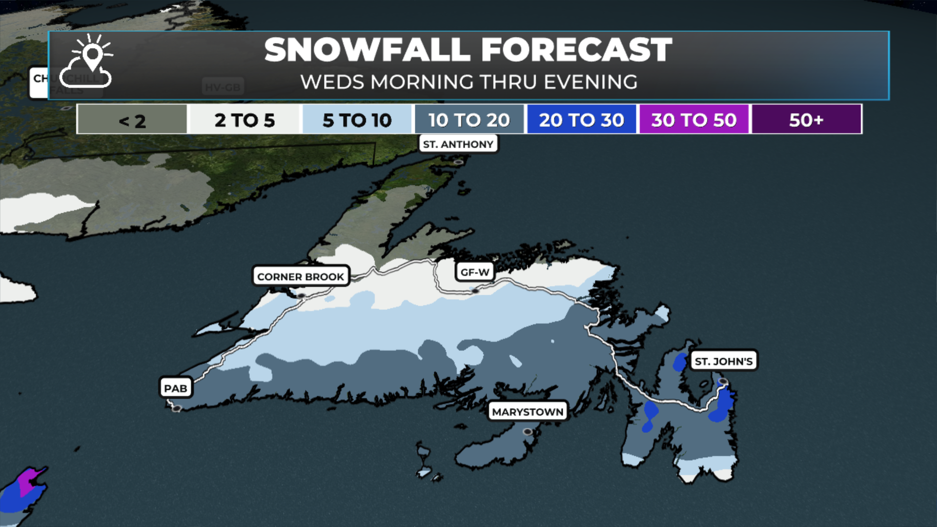 Snowfall totals will be 10 to 20 cm for the South Coast, Burin and Avalon Peninsulas. I expect the Avalon and Metro to end up closer to 20 cm.