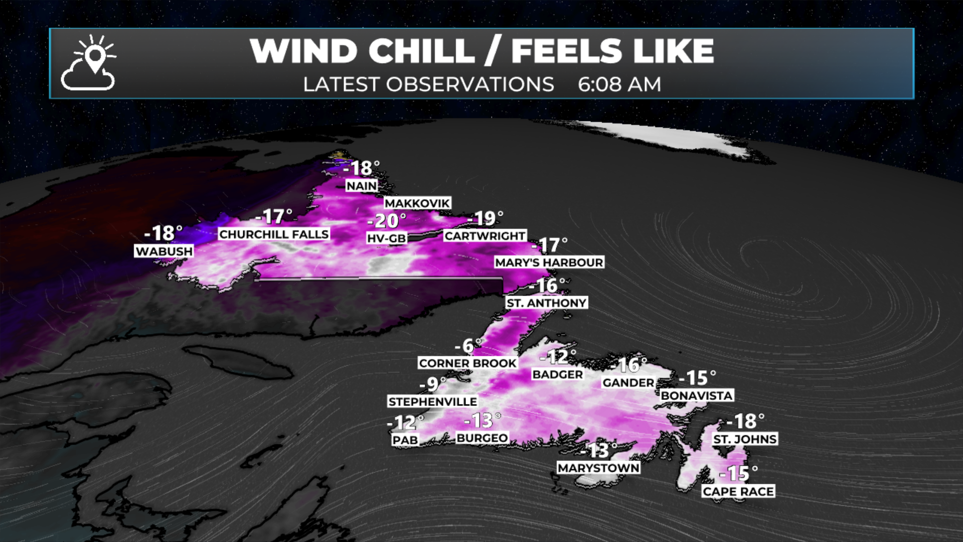 Wind chills as of 6:08 AM NDT on March 25, 2026
