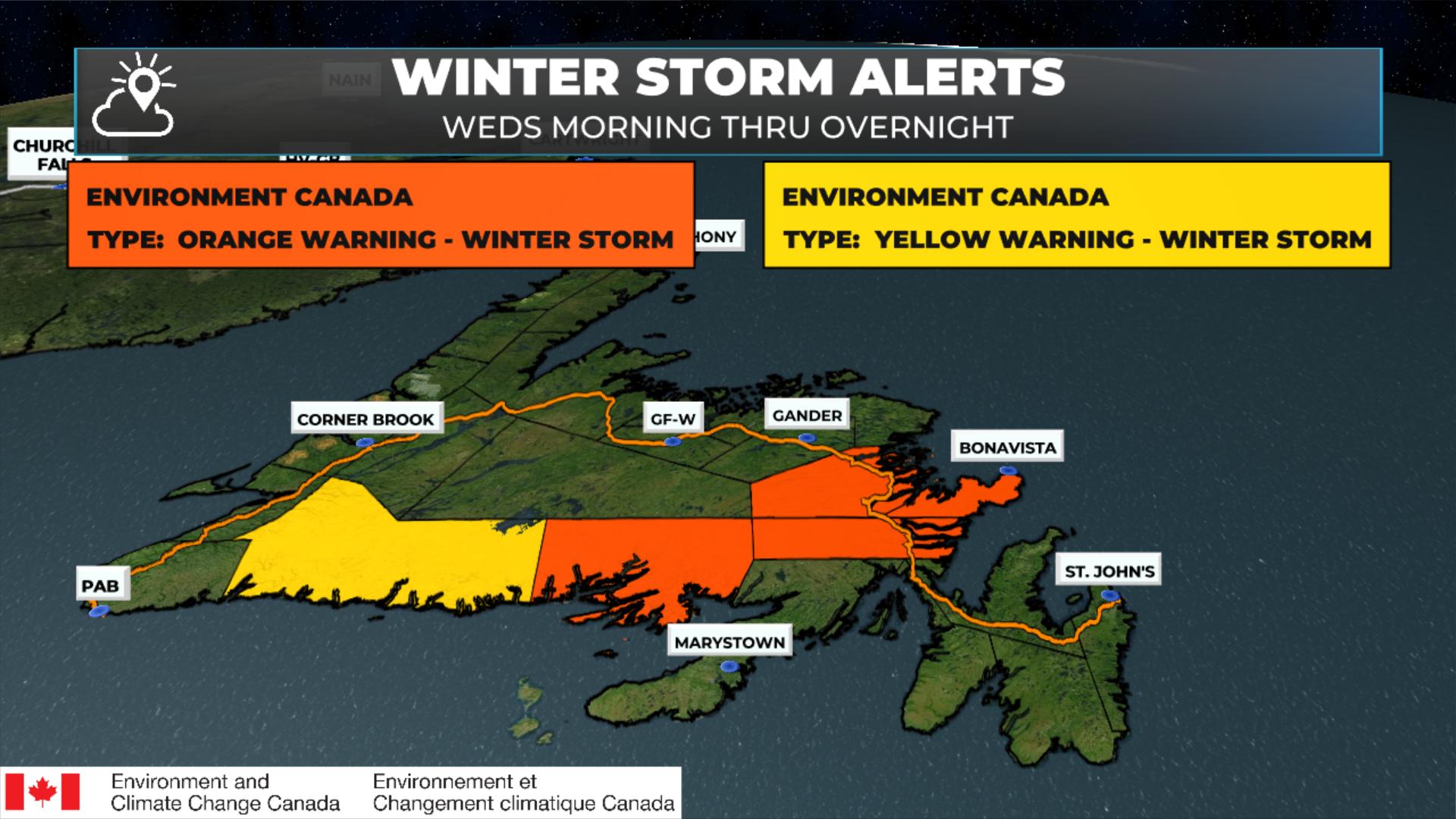 Winter weather alerts and wind alerts remain in effect this morning for a large chunk of the Island from the south coast to the Avalon and many areas between. We’ve got yellow warnings for wind and snowfall and both yellow and orange warnings for winter storm conditions.