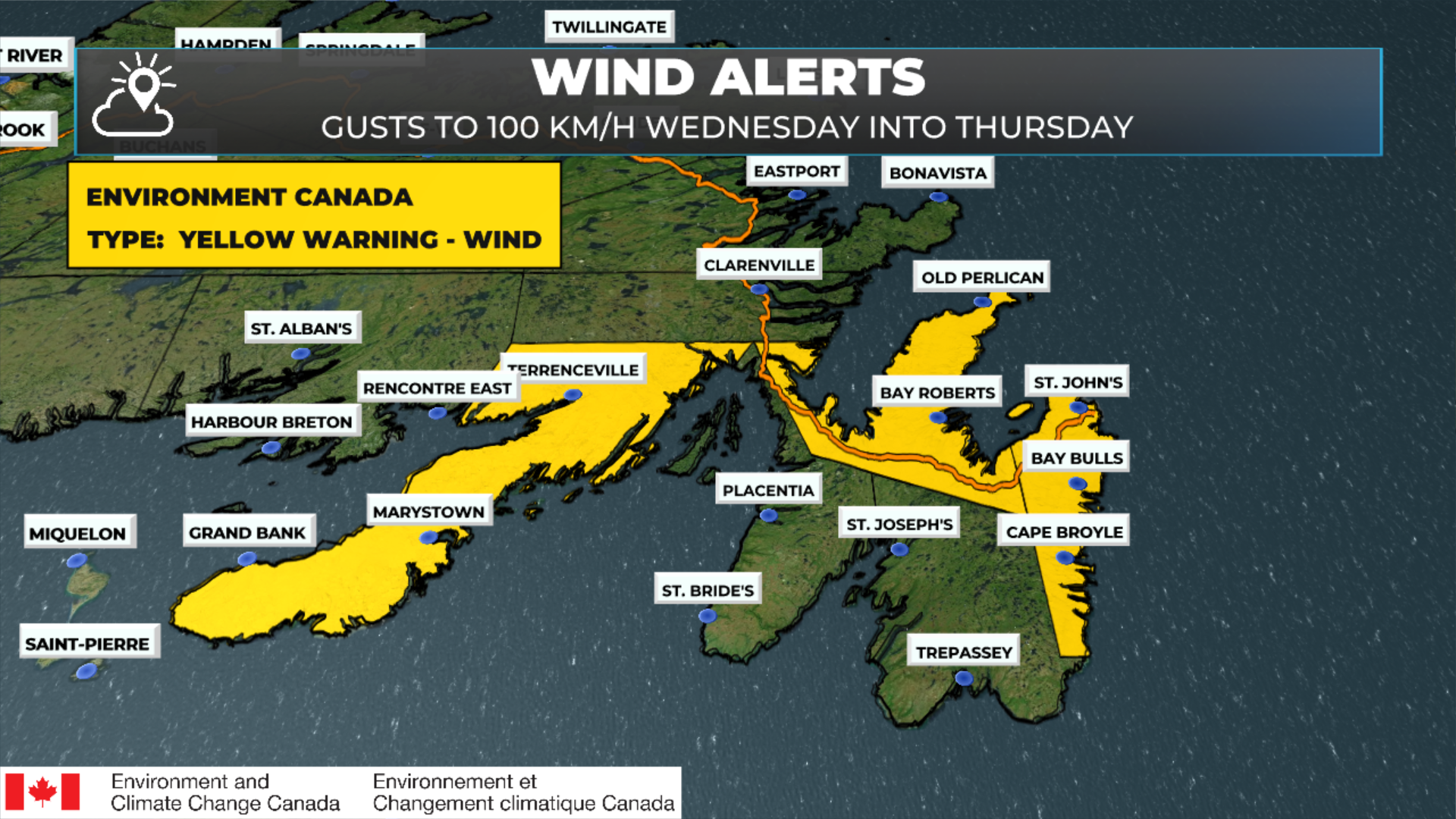 The other issue today will be the wind. Yellow Warnings for Wind are currently in effect for the Burin Peninsula and the Avalon Peninsula. On the Burin Peninsula, expect winds to gust from the north as high as 100 km/h this afternoon. On the Avalon, expect the wind gusts to ramp up this evening and gusts as high as 100 km/h from the north or northeast between then and early Thursday. The wind speeds will come down on Thursday morning. The Bonavista Peninsula is not under a Wind Alert at this time, but some areas will see winds as high, or higher, than the Avalon. One may be issued for the area.