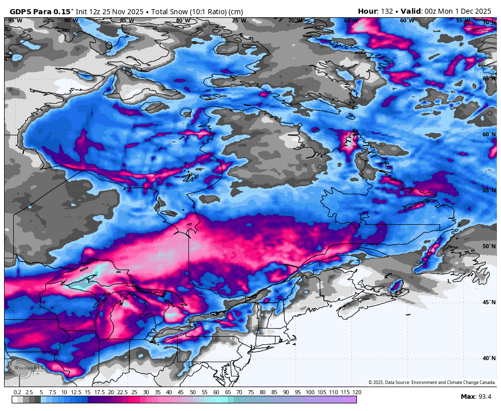 The snowfall forecast through Sunday evening, November 30, 2025 @ 8:30 PM NST.