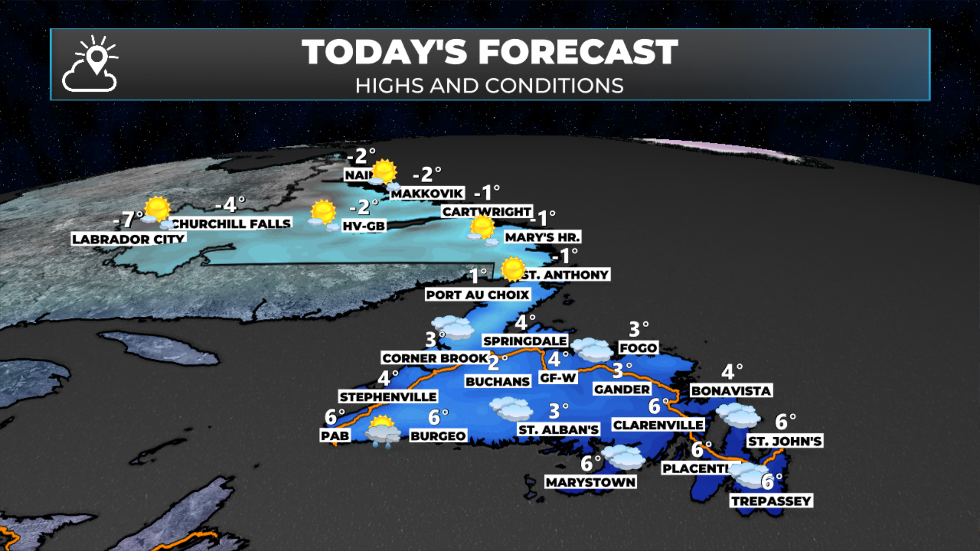 The day is starting generally quietly across the Province, with a few showers and/or flurries over western and southern sections of the Island. Temperatures are or below freezing on the Island and well below in Labrador. Some areas of the Big Land, particularly in the west, are near -10ºC. Temperatures on the Island today recover to the single digits above freezing everywhere except the Northern Peninsula — where highs will be near 0ºC. Labrador will see highs of -4ºC to -10ºC. The cooler readings will be found in the west.
