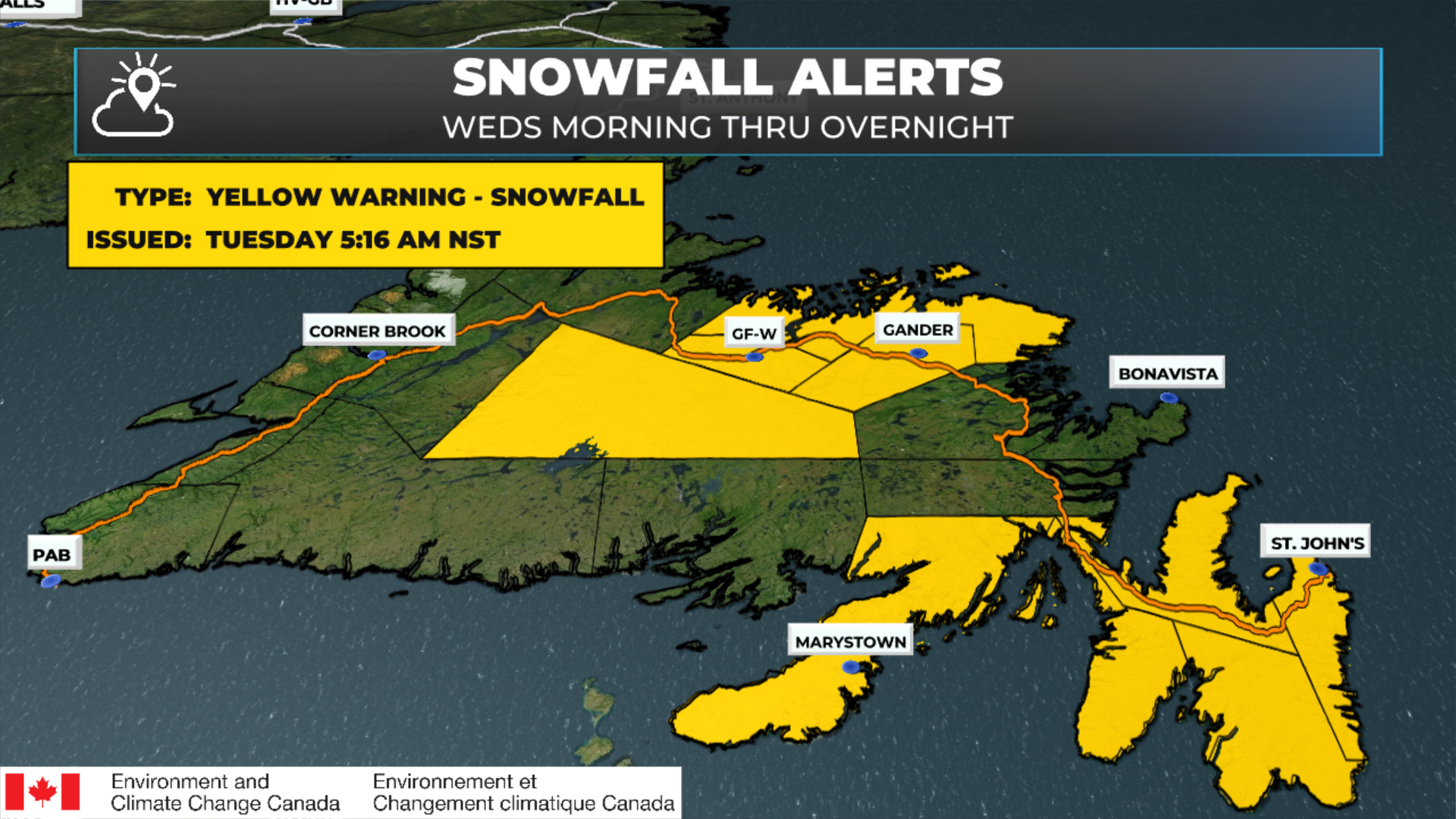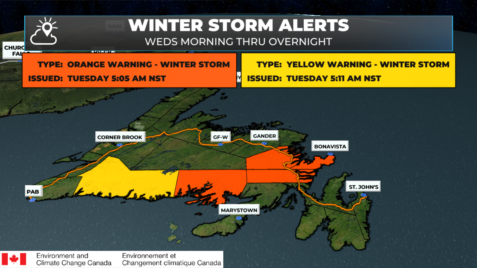This will lead to higher-end snowfall totals rather than lower in some areas. Last evening I was thinking 10 to 20 cm for much of the area. Now I suspect some locations will see closer to 30 cm on the high end. However, there will be a sharp gradient between that much snow and very little the farther south you go on the Avalon and Burin Peninsulas. Environment and Climate Change Canada has issued Winter Storm and Snowfall Warnings, as follows.