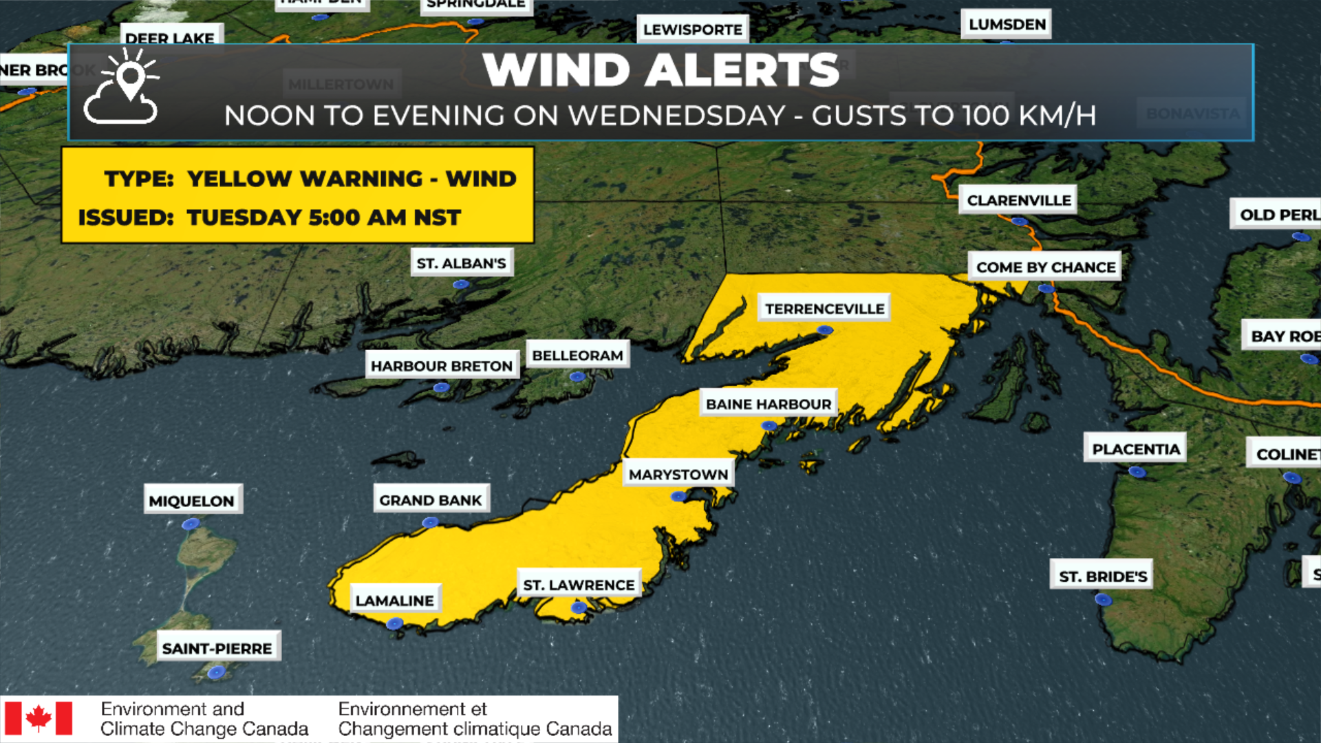 Strong winds capable of causing damage are expected. Winds are likely to be strongest for communities around Fortune Bay.